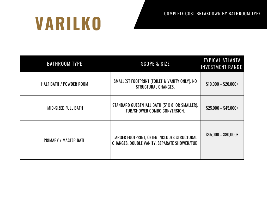 When reviewing the general Atlanta Bathroom Remodeling Cost ranges above, it’s important to remember that every project is unique. Our process at Varilko Remodeling ensures your budget aligns perfectly with your vision: